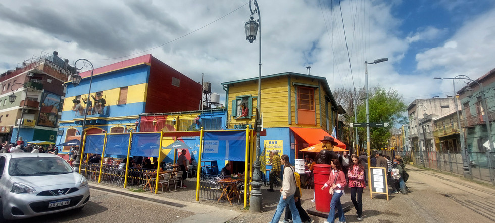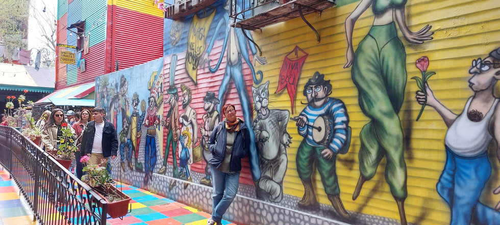Dann das Barrio La Boca hier wird`s kunterbunt - puhh welch ein Kontrastprogramm - hier steht mitten in den Häuserblocks, in leuchtendem gelb/blau, das alte Fußballstadion. Auch die Häuser sind knallebunt und an jeder Ecke sind die Idole der Bewohner:innen zu sehen. Maradona, Messi und der Papst.