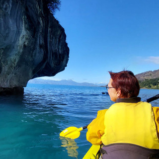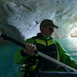 Bei Puerto Tranquilo fahren wir mit dem Kanu zu den Marmorkathedralen. Wir haben Glück und erwischen einen der wenigen windfreien Tage. Die Sonne scheint und der glasklare See liegt glatt wie ein Spiegel. Es ist wunderbar wie sich das Licht in den von Wind und Wellen in den Fels geformten Säulen und Höhlen reflektiert.