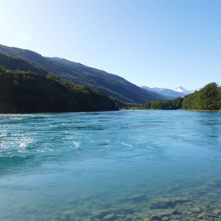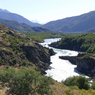 Ab Cochrane sind es noch über 1000 km bis zum Ende der Carretera Austral in Puerto Montt. Die Straße folgt jetzt dem Rio Baker, der sich leuchtend türkis durch die anfangs karge Steppe windet und dann in schäumenden Stromschnellen durch grüne Wälder fließt. Sie führt vorbei am Lago Bertrand mit seiner unglaublichen Farbe. Hier entspringt der Rio Baker der wasserreichste Fluss Chiles.