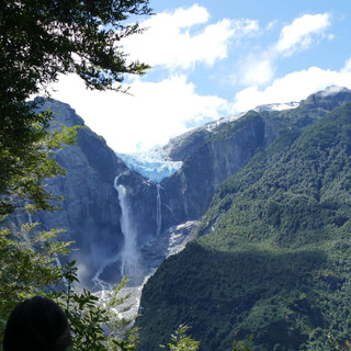 Tags drauf scheint wieder die Sonne und wir fahren in den Nationalpark Queulat. Dort gibt es einen Campingplatz und wir wollen hier zum hängenden Gletscher wandern. Es geht über Stock und Stein durch den Regenwald. Riesige Bäume, Baumfarne und Fuchsien stehen hier. Diesmal hat sich der Weg gelohnt, der Blick auf den Gletscher mit dem Wasserfall ist beeindruckend auch wenn wir etwas anstehen müssen um ihn zu genießen.